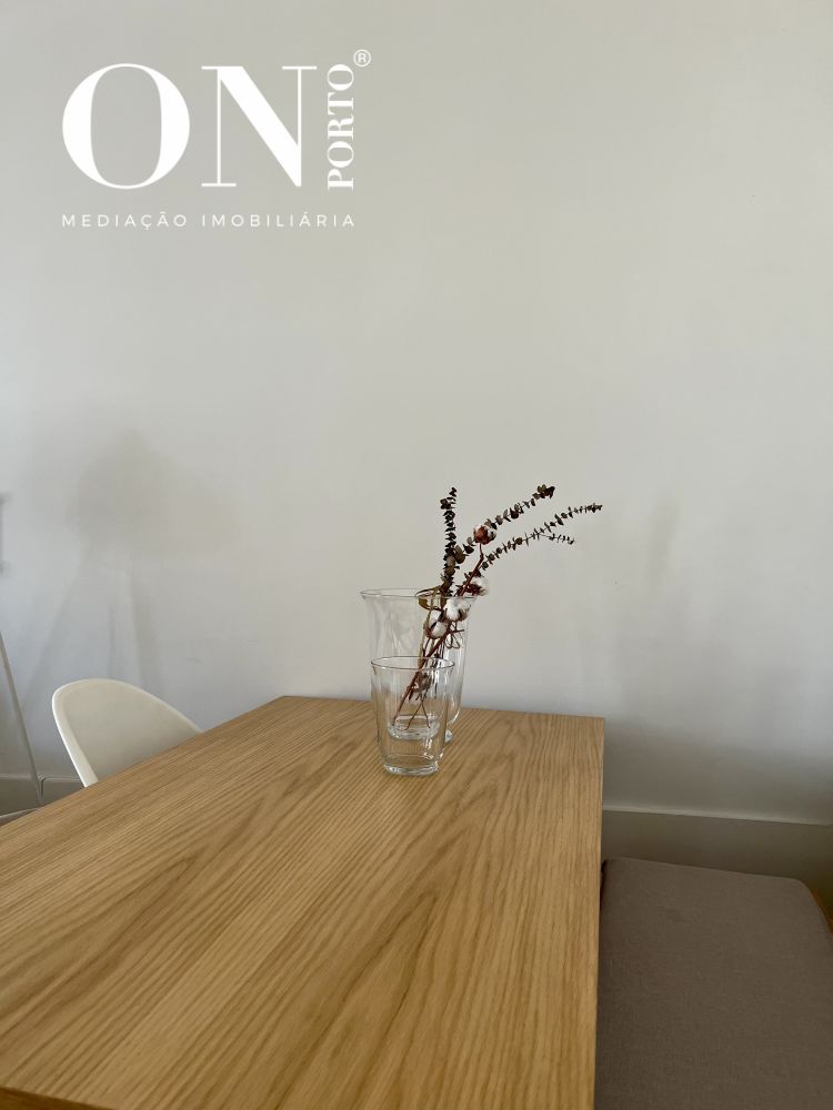 O apartamento apresenta uma sala em open space com a cozinha totalmente equipada, destacando-se a ilha central, que confere modernidade e funcionalidade ao espaço. A luminosidade natural e ligação direta ao exterior criam uma atmosfera acolhedora e contemporânea.