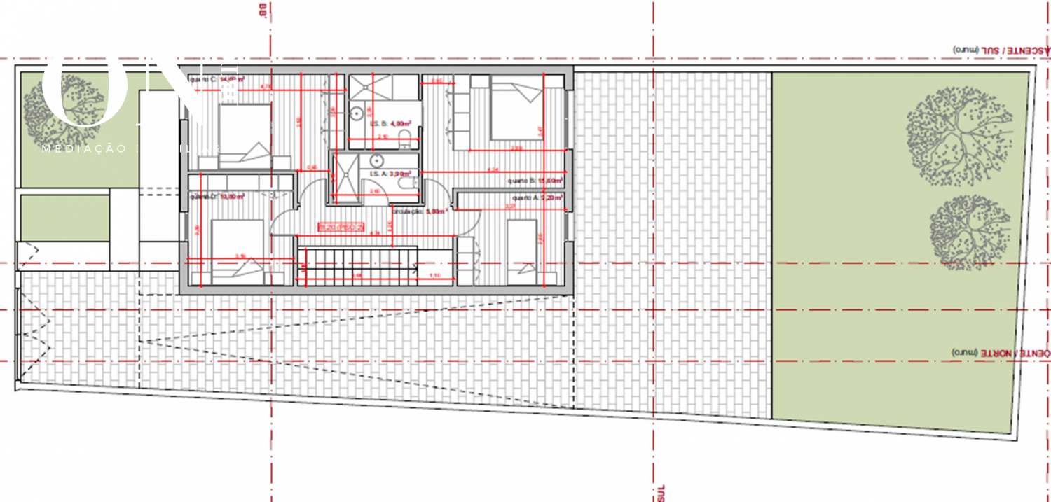 No acesso ao primeiro piso temos um hall de distribuição, um wc completo, quatro quartos com roupeiros embutidos, sendo um deles suite.